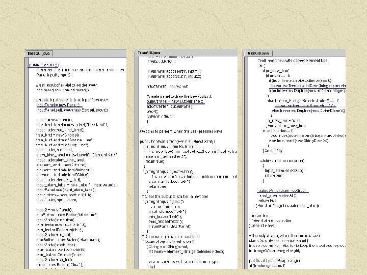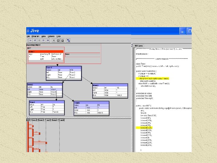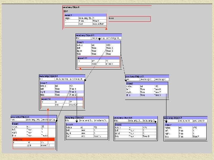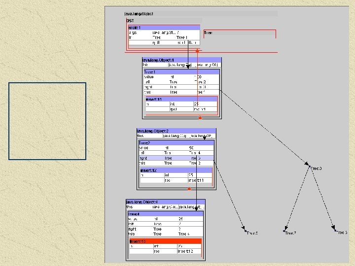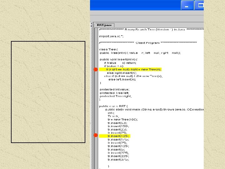 class Tree { public Tree(int n) { value = n; left = null; right = null; } protected int value; protected Tree left; protected Tree right; } public void insert(int n) { if (value == n) return; if (value < n) if (right == null) right = new Tree(n); else right. insert(n); else if (left == null) left = new Tree(n); else left. insert(n); }