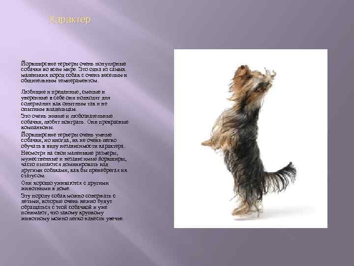 Характер Йоркширские терьеры очень популярные собачки во всем мире. Это одна из самых маленьких пород собак с очень веселым и общительным темпераментом. Любящие и преданные, смелые и уверенные в себе они подходят для содержания как опытным так и не опытным владельцам. Это очень живые и любознательные собачки, любят поиграть. Они прекрасные компаньоны. Йоркширские терьеры очень умные собачки, но иногда, их не очень легко обучать в виду независимости характера. Несмотря на свои маленькие размеры, мужественные и независимые йоркширы, часто пытаются доминировать над другими собаками, как бы пренебрегая их статусом. Они хорошо уживаются с другими животными в доме. Эту породу собак можно содержать с детьми, которые очень нежно будут обращаться с этой собачкой и уже понимают, что такому хрупкому животному можно легко нанести увечье.
