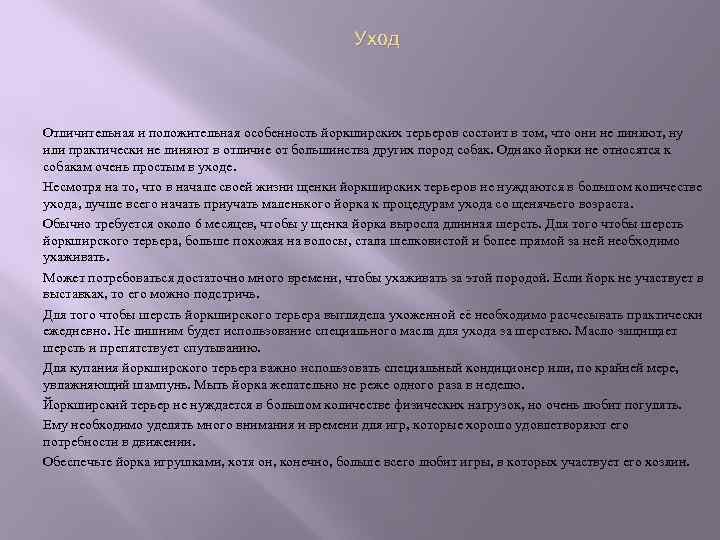Уход Отличительная и положительная особенность йоркширских терьеров состоит в том, что они не линяют, ну или практически не линяют в отличие от большинства других пород собак. Однако йорки не относятся к собакам очень простым в уходе. Несмотря на то, что в начале своей жизни щенки йоркширских терьеров не нуждаются в большом количестве ухода, лучше всего начать приучать маленького йорка к процедурам ухода со щенячьего возраста. Обычно требуется около 6 месяцев, чтобы у щенка йорка выросла длинная шерсть. Для того чтобы шерсть йоркширского терьера, больше похожая на волосы, стала шелковистой и более прямой за ней необходимо ухаживать. Может потребоваться достаточно много времени, чтобы ухаживать за этой породой. Если йорк не участвует в выставках, то его можно подстричь. Для того чтобы шерсть йоркширского терьера выглядела ухоженной её необходимо расчесывать практически ежедневно. Не лишним будет использование специального масла для ухода за шерстью. Масло защищает шерсть и препятствует спутыванию. Для купания йоркширского терьера важно использовать специальный кондиционер или, по крайней мере, увлажняющий шампунь. Мыть йорка желательно не реже одного раза в неделю. Йоркширский терьер не нуждается в большом количестве физических нагрузок, но очень любит погулять. Ему необходимо уделять много внимания и времени для игр, которые хорошо удовлетворяют его потребности в движении. Обеспечьте йорка игрушками, хотя он, конечно, больше всего любит игры, в которых участвует его хозяин.