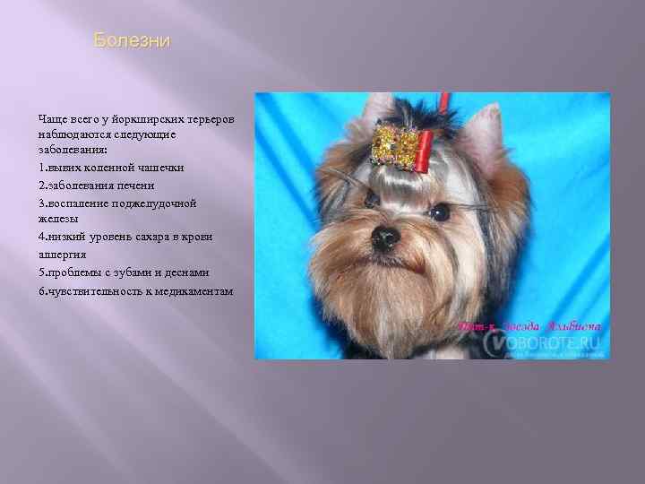 Болезни Чаще всего у йоркширских терьеров наблюдаются следующие заболевания: 1. вывих коленной чашечки 2. заболевания печени 3. воспаление поджелудочной железы 4. низкий уровень сахара в крови аллергия 5. проблемы с зубами и деснами 6. чувствительность к медикаментам