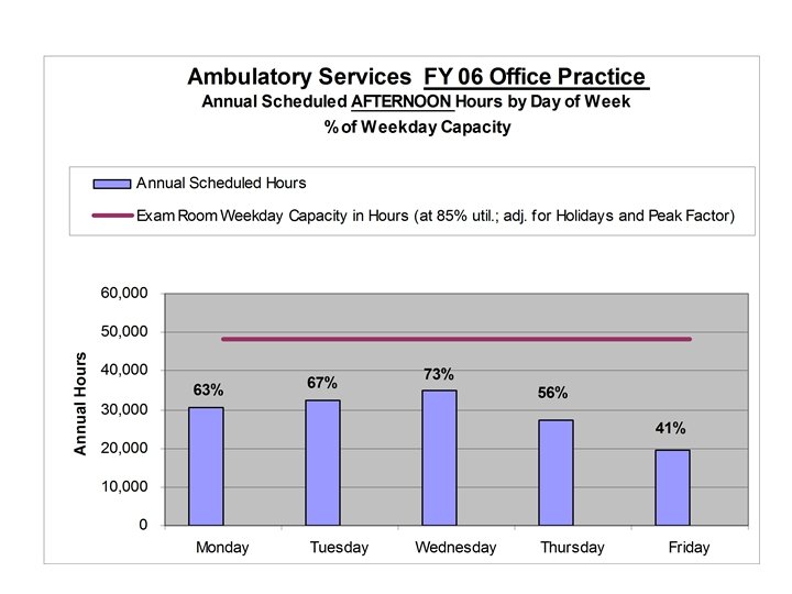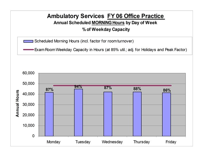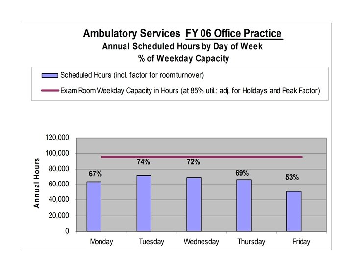 Exam Room Availability n Assume room available 8 hours, M-F q q q n Two 4 hours sessions 250 days a year (less 10 holidays) One room available 2, 000 hours/year For each practice suite - include all clinics/ providers (MDs, NPs, etc. ) using exam room space in that location