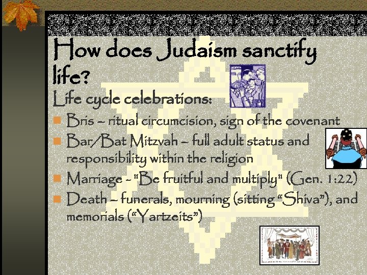 How does Judaism sanctify life? Life cycle celebrations: n Bris – ritual circumcision, sign of the covenant n Bar/Bat Mitzvah – full adult status and responsibility within the religion n Marriage - "Be fruitful and multiply" (Gen. 1: 22) n Death – funerals, mourning (sitting “Shiva”), and memorials (“Yartzeits”)