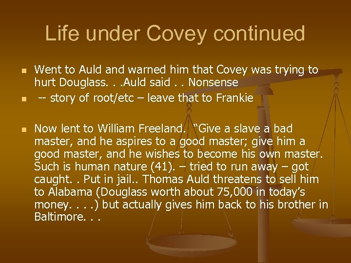 Life under Covey continued n n n Went to Auld and warned him that Covey was trying to hurt Douglass. . . Auld said. . Nonsense -- story of root/etc – leave that to Frankie Now lent to William Freeland. “Give a slave a bad master, and he aspires to a good master; give him a good master, and he wishes to become his own master. Such is human nature (41). – tried to run away – got caught. . Put in jail. . Thomas Auld threatens to sell him to Alabama (Douglass worth about 75, 000 in today’s money. . ) but actually gives him back to his brother in Baltimore. . .