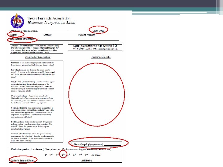 Basic Judging Tips • Filling out a ballot ▫ Fill out any/all incomplete information (ex. competitor’s name(s) and school code, Round #, Section #, as well as the performer’s TITLE, and their TIME after they have performed (not the time on the clock, but how long their piece ran- ex. 9: 26) ▫ You will also RANK the students by circling the number (1 st = best in the room, 6 th = 6 th best in the room) ▫ There cannot be TIES ▫ SIGN the ballot, and provide your affiliation (what school brought you, or who hired you) if required ▫ Give both POSITIVE and NEGATIVE comments (things to fix, work on, decisions that did not make sense to you, etc. ) ▫ If you give a student a 5 or 6, be sure to explain your decision (lots of things to work on, tough room, etc. ) • Don’t be afraid to ASK QUESTIONS!