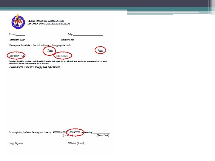 Judging Speech Events • Oratory speeches are prewritten and memorized before the tournament • Extemp – students draw topics at the tournament and choose one. They have 30 minutes to prepare a 5 -7 min. speech. They will come to your room to perform their speech after their time in the prep room. They only have the prep materials they brought with them to the tournament for sources. • Extemp is divided into two categories, U. S. (Domestic) and Foreign (International). • We also offer Novice.