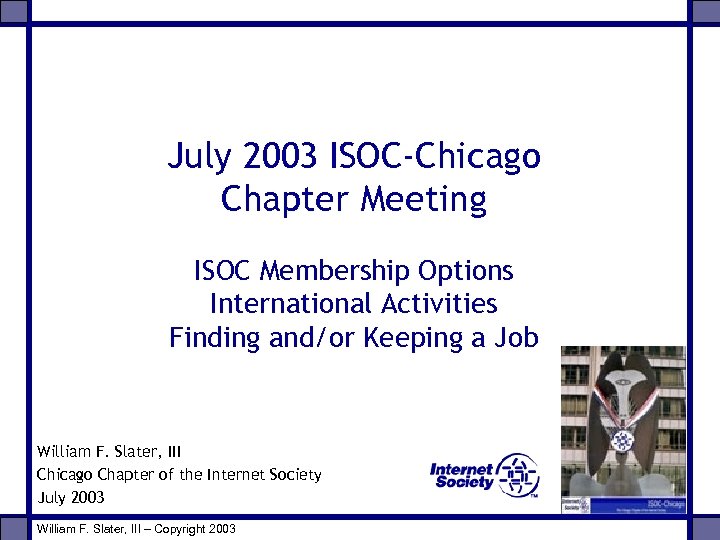 July 2003 ISOC-Chicago Chapter Meeting ISOC Membership Options International Activities Finding and/or Keeping a Job William F. Slater, III Chicago Chapter of the Internet Society July 2003 William F. Slater, III – Copyright 2003