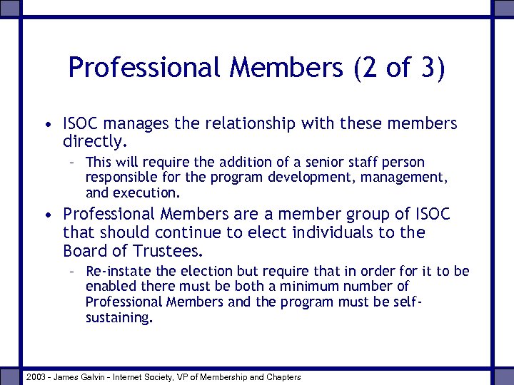Professional Members (introduction) • Two key points: – Having a professional membership category does not, in and of itself, require ISOC to be a Professional Society. – To be professional is to follow a line of conduct as though it were a profession (according to Merriam Webster). • This category of membership increases our credibility as compared to Global Membership. – An underlying reason for this is because we will "know" who are professional members are whereas we can not say for sure that an asserted Global Member identity represents an actual live person. • What kind of professional? – Based on “The Internet is for everyone, ” we need to include the broadest set of people. This suggests that requiring educational or work experience is overly restrictive because it excludes users. Including users sets us apart from related organizations. 2003 - James Galvin - Internet Society, VP of Membership and Chapters