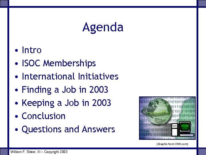 Agenda • • Intro ISOC Memberships International Initiatives Finding a Job in 2003 Keeping a Job in 2003 Conclusion Questions and Answers (Graphic from CNN. com) William F. Slater, III – Copyright 2003