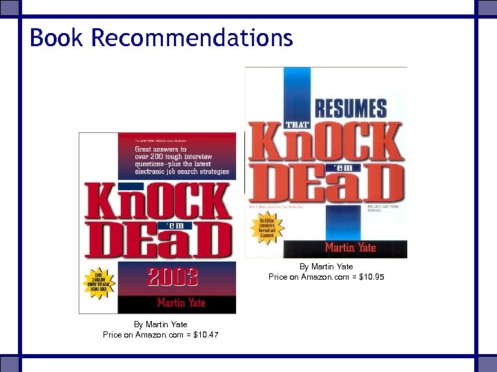 Book Recommendations By Martin Yate Price on Amazon. com = $10. 95 By Martin Yate Price on Amazon. com = $10. 47