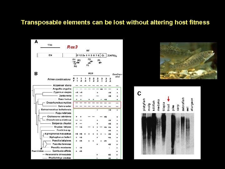 zebrafish eel sturgeon pike carp tilapia trout molly killifish medaka platyfish Transposable elements can be lost without altering host fitness Rex 3 C