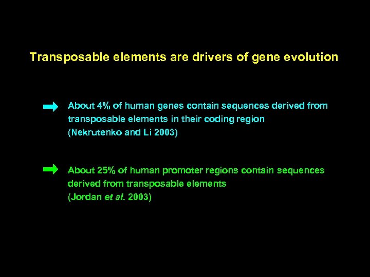 Transposable elements are drivers of gene evolution About 4% of human genes contain sequences derived from transposable elements in their coding region (Nekrutenko and Li 2003) About 25% of human promoter regions contain sequences derived from transposable elements (Jordan et al. 2003)