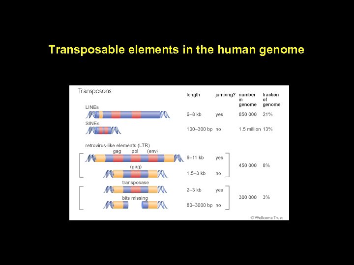 Transposable elements can cause disease Element Organism Disease Gene Mechanism L 1 L 1 Alu Alu SVA L 1 IAP Human Human Mouse Haemophilia A DMD Colon carcinoma Breast cancer Haemophilia B Dent's disease Various Myoclonus Various Factor VIII Dystrophin APC BRCA 2 Factor IX CLCN 5 Various Glrb Various Insertion Insertion Insertion L 1 Alu Alu L 1 Human Human Mouse Glycogen storage dis. Hunter disease Wiskott-Aldrich sdr Lesch-Nyhan sdr Beige-like coat color PHKB IDS WASP HPRT 1 HPRT Lystbg Ectopic recombination (del) Ectopic recombination (dupl) Ectopic recombination (del) Alu Alu Human Ornithine AT def. Sly syndrome Alport syndrome OAT GUSB COL 4 A 3 Exonisation