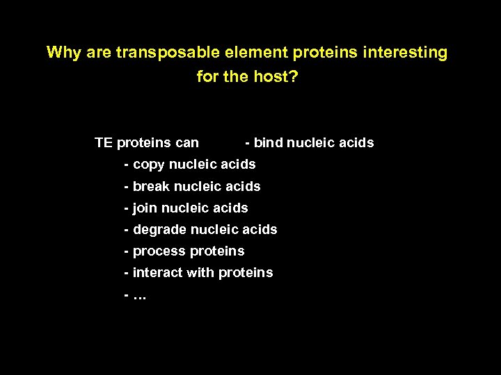 Why are transposable element proteins interesting for the host? TE proteins can - bind nucleic acids - copy nucleic acids - break nucleic acids - join nucleic acids - degrade nucleic acids - process proteins - interact with proteins -…