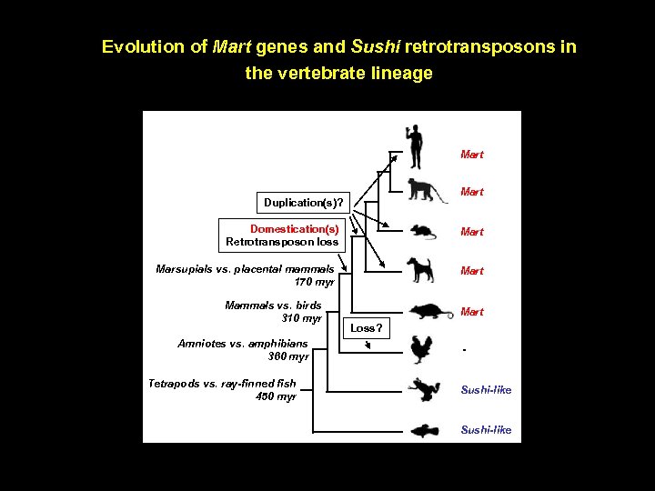 Evolution of Mart genes and Sushi retrotransposons in the vertebrate lineage Mart Duplication(s)? Domestication(s) Retrotransposon loss Mart Marsupials vs. placental mammals 170 myr Mammals vs. birds 310 myr Amniotes vs. amphibians 360 myr Tetrapods vs. ray-finned fish 450 myr Mart Loss? - Sushi-like