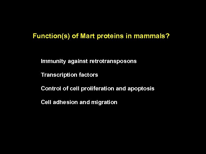 Function(s) of Mart proteins in mammals? Immunity against retrotransposons Transcription factors Control of cell proliferation and apoptosis Cell adhesion and migration
