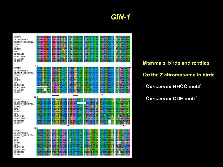 GIN-1 Mammals, birds and reptiles * * On the Z chromosome in birds - Conserved HHCC motif - Conserved DDE motif