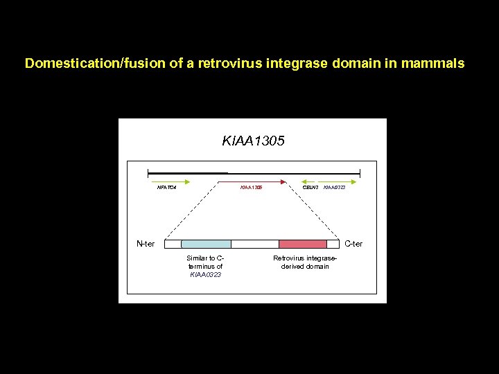 Domestication/fusion of a retrovirus integrase domain in mammals KIAA 1305 NFATC 4 KIAA 1305 CBLN 3 KIAA 0323 N-ter C-ter Similar to Cterminus of KIAA 0323 Retrovirus integrasederived domain
