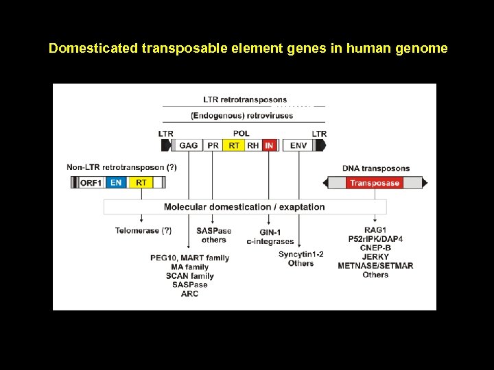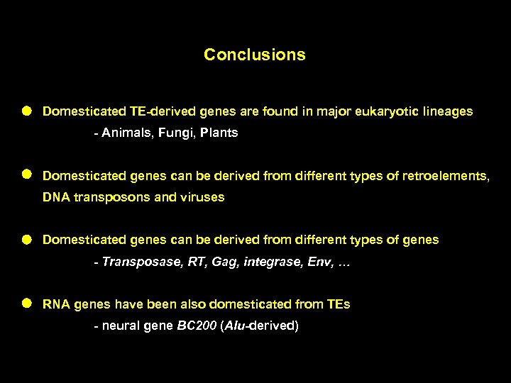 Conclusions Domesticated TE-derived genes are found in major eukaryotic lineages - Animals, Fungi, Plants Domesticated genes can be derived from different types of retroelements, DNA transposons and viruses Domesticated genes can be derived from different types of genes - Transposase, RT, Gag, integrase, Env, … RNA genes have been also domesticated from TEs - neural gene BC 200 (Alu-derived)