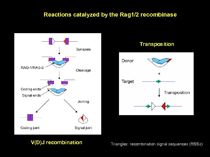 Reactions catalyzed by the Rag 1/2 recombinase Transposition V(D)J recombination Triangles: recombination signal sequences (RSSs)