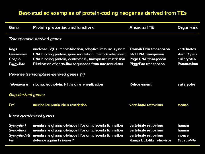 Best-studied examples of protein-coding neogenes derived from TEs P Gene Protein properties and functions Ancestral TE Organisms Transib DNA transposon h. AT DNA transposon Pogo DNA transposon Piggy. Bac transposon vertebrates Arabidopsis eukaryotes Paramecium Retroelement eukaryotes vertebrate retrovirus mouse vertebrate retrovirus Kanga BEL-like retrovirus human mouse Drosophila Transposase-derived genes Rag 1 Daysleeper Cenp-b Piggy. Mac nuclease, V(D)J recombination, adaptive immune system DNA binding protein, gene regulation, plant development DNA binding protein, centromere, transposon restriction Elimination of germ-line sequences from macronucleus Reverse transcriptase-derived genes (? ) Telomerase ribonucleoprotein, RT, telomere replication Gag-derived genes Fv 1 murine leukemia virus restriction Envelope-derived genes Syncytin-1 Syncytin-2 Syncytin-A/B Iris membrane glycoprotein, cell fusion, placenta formation defence against viruses?