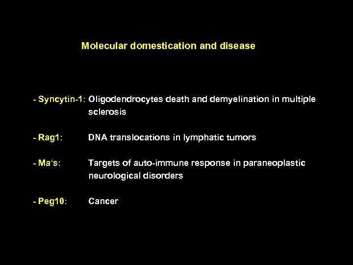 Molecular domestication and disease - Syncytin-1: Oligodendrocytes death and demyelination in multiple sclerosis - Rag 1: DNA translocations in lymphatic tumors - Ma‘s: Targets of auto-immune response in paraneoplastic neurological disorders - Peg 10: Cancer