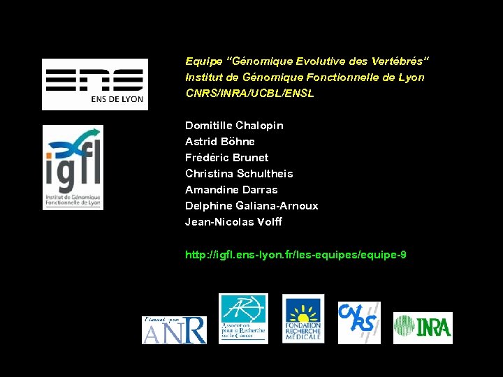 Equipe “Génomique Evolutive des Vertébrés“ Institut de Génomique Fonctionnelle de Lyon CNRS/INRA/UCBL/ENSL Domitille Chalopin Astrid Böhne Frédéric Brunet Christina Schultheis Amandine Darras Delphine Galiana-Arnoux Jean-Nicolas Volff http: //igfl. ens-lyon. fr/les-equipes/equipe-9