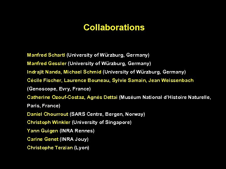 Collaborations Manfred Schartl (University of Würzburg, Germany) Manfred Gessler (University of Würzburg, Germany) Indrajit Nanda, Michael Schmid (University of Würzburg, Germany) Cécile Fischer, Laurence Bouneau, Sylvie Samain, Jean Weissenbach (Genoscope, Evry, France) Catherine Ozouf-Costaz, Agnés Dettai (Muséum National d’Histoire Naturelle, Paris, France) Daniel Chourrout (SARS Centre, Bergen, Norway) Christoph Winkler (University of Singapore) Yann Guigen (INRA Rennes) Carine Genet (INRA Jouy) Christophe Terzian (Lyon)