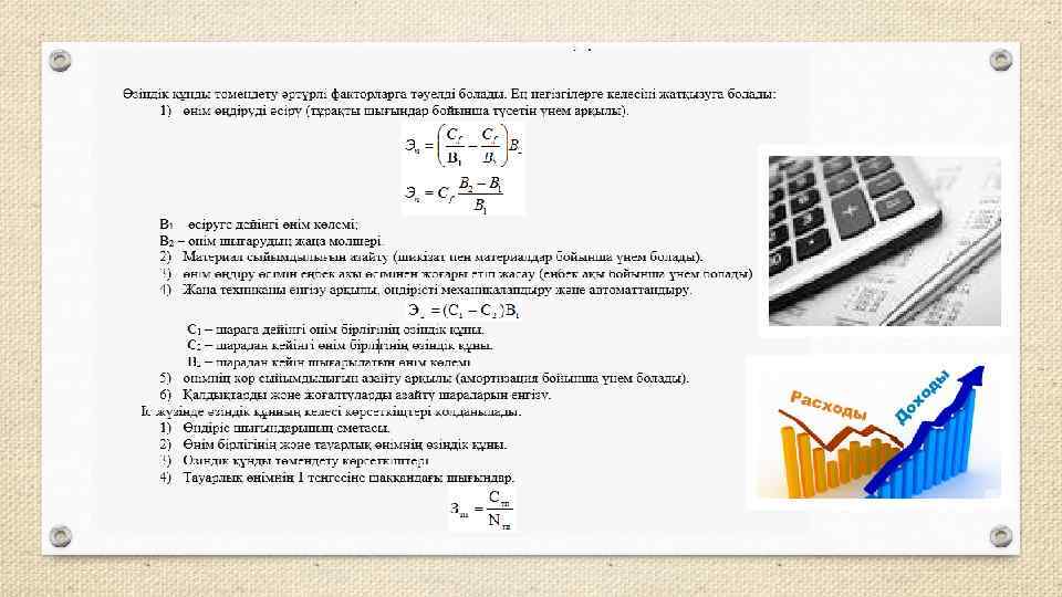 Калькуляция шығындарының баптары. № п. п. Баптар Шығындар Шығын түрі 1. Шикізат пен негізгі материалдар негізгі қарапайым, тура 2. Қайтарылатын қалдықтар құны негізгі қарапайым, тура 3. Жартылай фабрикаттар, көмекші материалдар негізгі қарапайым, тура 4. Техн. мақсаттағы отын және энергия негізгі қарапайым, тура 5. Өндір. жұмысш негізгі еңбек ақысы негізгі қарапайым, тура 6. Өндір. жұмысш. қосымша еңбек ақысы негізгі қарапайым, тура 7. Әлеуметтік төлемдер негізгі қарапайым, тура 8. Жаңа өнімді даярлау және игеру шығыны негізгі кешенді, тура 9. Жабдықты күту және пайд. шығындары негізгі кешенді, жанама 10. Басқа үстеме шығындар үстеме кешенді, жанама Өндірістік өзіндік құн = 1 – 10 сомасы 11. Мерзім шығындары Толық өзіндік құн = Өндірістік өзіндік құн +11