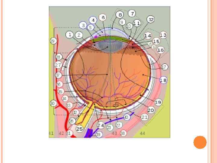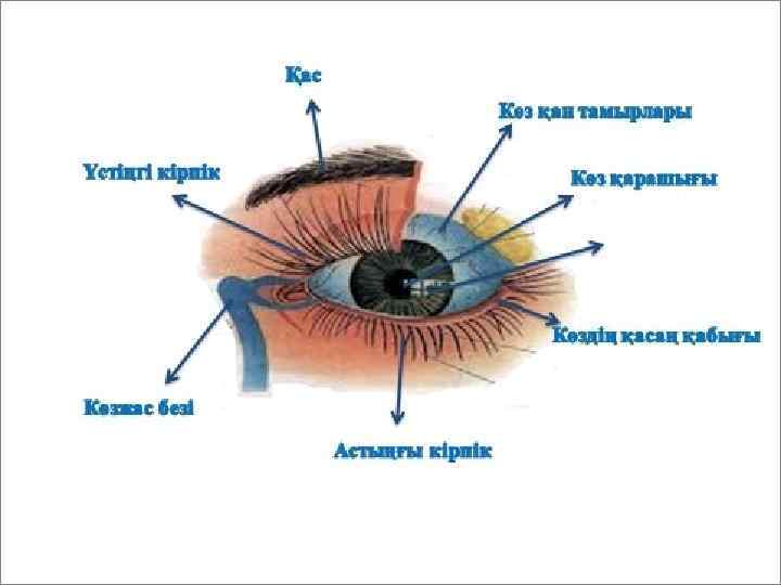 Көз 1 — қасаң қабық; 2 — көз алмасының алдыңғы камерасы; 3 — нұрлы қабықша; 4 — көз алмасының артқы камерасы; 5 — көз бұршағы; 6 — кірпікті дене; 7 — конъюнктива; 8 — кірпікті дене; 9 — көздің шеткі тік б/е; 10 — көздің ішкі тік б/е; 11 — меншікті тамырлы қабықша; 12 — шыны тәрізді дене; 13 — склера; 14 —торлы қабықша; 15 — көру жүйкесігнің дискісі; 16 — көру жүйкесі