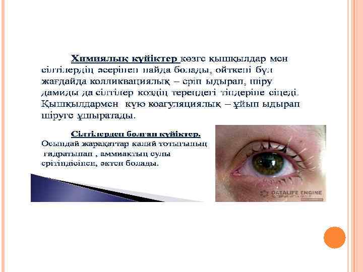 КӨЗ ЗАҚЫМДАНҒАНДА КӨРСЕТІЛЕТІН АЛҒАШҚЫ ЖӘРДЕМ. ЕГЕР КӨЗГЕ ҚОҚЫМ ТҮССЕ, ОНДА ҚОЛ ОРАМАЛМЕН НЕМЕСЕ МАҚТАМЕН СҮРТЕДІ. АЛ КӨЗ АУЫР ЖАРАҚАТТАНСА, ОНДА КӨЗДІ ТАЗА ТАҢҒЫШПЕНБАЙЛАП, ЗАРДАП ШЕГУШІНІ АУРУХАНАҒА ТЕЗ АРАДА ЖЕТКІЗГЕН ЖӨН. АЛ КӨЗГЕ ҰНТАҚ, ҚЫШҚЫЛ, СІЛТІ ЖӘНЕ УЛЫ ЗАТТАР ТҮССЕ, ОНДА ДЕРЕУ ДӘРІГЕРГЕ ҚАРАЛУ ҚАЖЕТ. КӨЗГЕ БӨГДЕ ЗАТТАРДЫҢ ТИЮІ ӨТЕ ЗИЯН, МҰНДАЙДА КӨЗГЕ АҚ ТҮСЕДІ. КӨЗ ЗАҚЫМДАНҒАНДА КӨРСЕТІЛЕТІН АЛҒАШҚЫ ЖӘРДЕМ ЕГЕР КӨЗГЕ БӨГДЕ ЗАТ ТҮССЕ, ДЕРЕУ КАЙНАТЫЛҒАН ЖЫЛЫ СУМЕН КӨЗДІ СЫРТЫНАН ІШІНЕ КАРАЙ ЖУУ; КӨЗГЕ ҚЫШҚЫЛ, СІЛТІ СИЯҚТЫ СҰЙЫҚТЫҚТАР ТИСЕ, СУДЫ АҒЫЗЫП ҚОЙЫП ЖУУ; КӨЗДІ ЕШ УАҚЫТТА ҚОЛМЕН УҚАЛАУҒА, СҮРТУГЕ БОЛМАЙДЫ; ТЕК ТАЗА, ЖҰМСАҚ ШҮБЕРЕКПЕН СҮРТЕДІ.