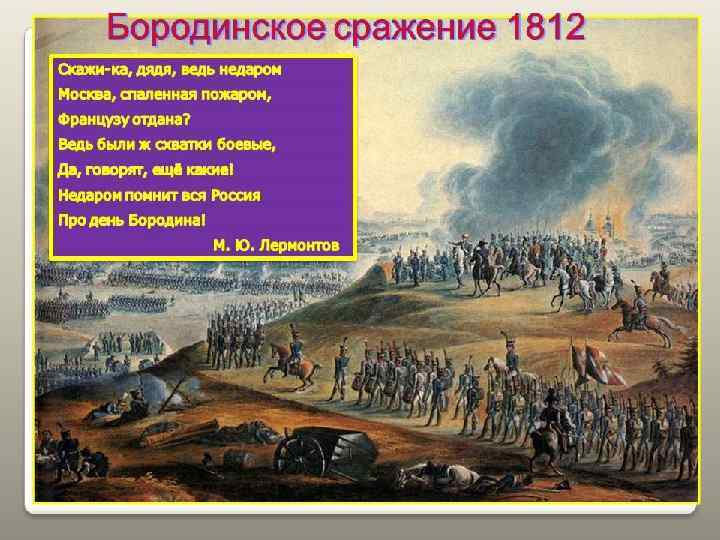 Сквозь дым летучий Французы двинулись, как тучи и все на наш редут.
