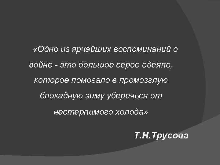 «Одно из ярчайших воспоминаний о войне - это большое серое одеяло, которое помогало в промозглую блокадную зиму уберечься от нестерпимого холода» Т. Н. Трусова