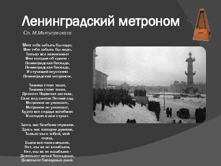 Ленинградский метроном Сл. М. Матусовского Мне тебя забыть бы надо, Только всё напоминает Мне сегодня об одном Ленинградская блокада, И стучащий неустанно Ленинградский метроном. Тишина стоит такая, Дремлет Нарвская застава, Спит под снегом Летний сад. Метроном не умолкает, Будто все сердца погибших И сегодня в нём стучат. Здесь нас бомбами глушили, Здесь нас голодом душили, Только мы с тобой, мой город, Были всё-таки сильней. Нет, мы их не позабыли, Нет, мы их не позабыли Девятьсот ночей блокадных, Девятьсот блокадных дней.