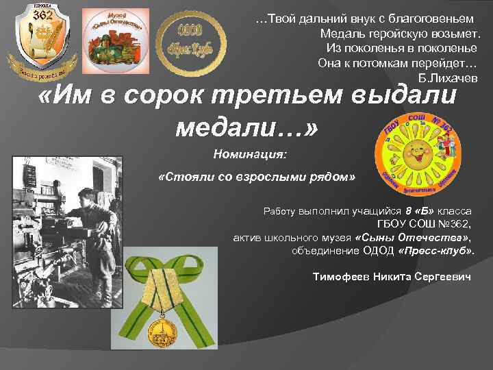 …Твой дальний внук с благоговеньем Медаль геройскую возьмет. Из поколенья в поколенье Она к потомкам перейдет… Б. Лихачев «Им в сорок третьем выдали медали…» Номинация: «Стояли со взрослыми рядом» Работу выполнил учащийся 8 «Б» класса ГБОУ СОШ № 362, актив школьного музея «Сыны Отечества» , объединение ОДОД «Пресс-клуб» . Тимофеев Никита Сергеевич