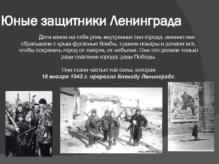 Юные защитники Ленинграда Дети взяли на себя роль внутренних сил города, именно они сбрасывали с крыш фугасные бомбы, тушили пожары и делали все, чтобы сохранить город от смерти, от небытия. Они это делали только ради спасения города, ради Победы. Они стали частью той силы, которая 18 января 1943 г. прорвала блокаду Ленинграда.