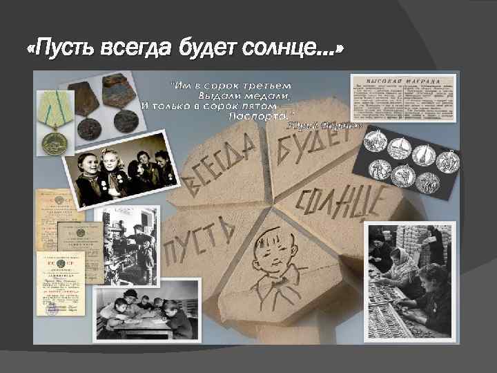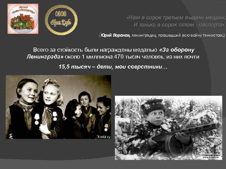 «Нам в сорок третьем выдали медали. И только в сорок пятом - паспорта» (Юрий Воронов, ленинградец, прошедший всю войну танкистом. ) Всего за стойкость были награждены медалью «За оборону Ленинграда» около 1 миллиона 470 тысяч человек, из них почти 15, 5 тысяч – дети, мои сверстники…