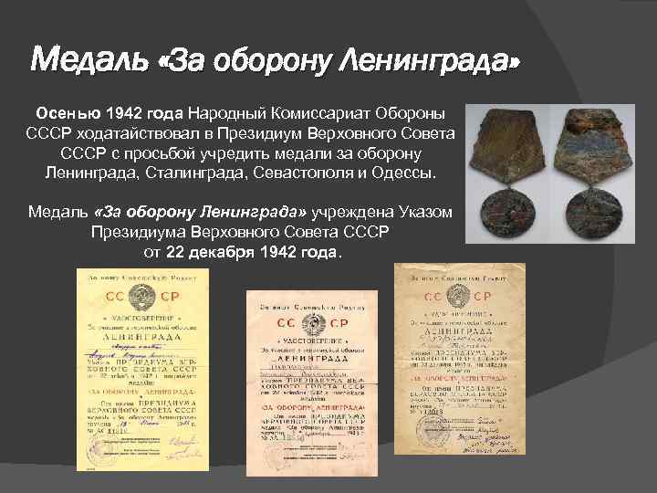 Медаль «За оборону Ленинграда» Осенью 1942 года Народный Комиссариат Обороны СССР ходатайствовал в Президиум Верховного Совета СССР с просьбой учредить медали за оборону Ленинграда, Сталинграда, Севастополя и Одессы. Медаль «За оборону Ленинграда» учреждена Указом Президиума Верховного Совета СССР от 22 декабря 1942 года.
