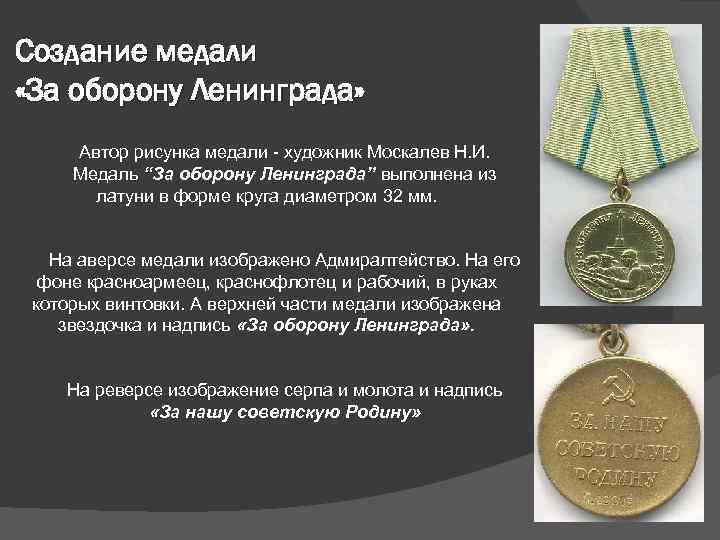 Создание медали «За оборону Ленинграда» Автор рисунка медали - художник Москалев Н. И. Медаль “За оборону Ленинграда” выполнена из латуни в форме круга диаметром 32 мм. На аверсе медали изображено Адмиралтейство. На его фоне красноармеец, краснофлотец и рабочий, в руках которых винтовки. А верхней части медали изображена звездочка и надпись «За оборону Ленинграда» . На реверсе изображение серпа и молота и надпись «За нашу советскую Родину»