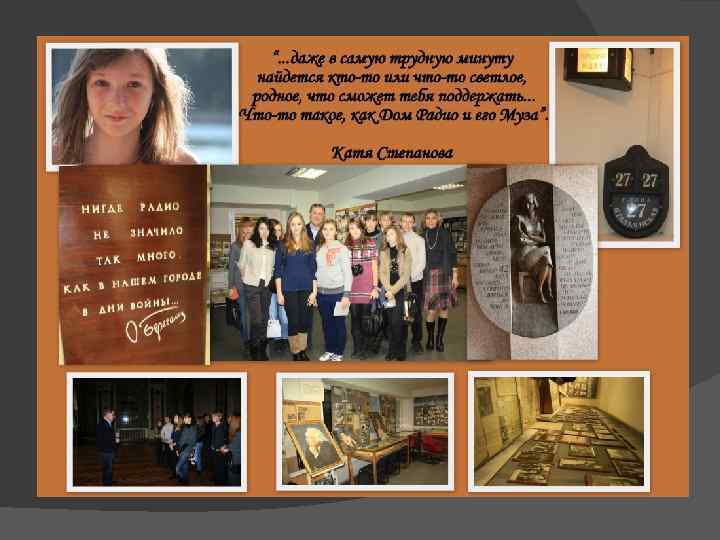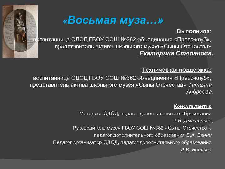 «Восьмая муза…» Выполнила: воспитанница ОДОД ГБОУ СОШ № 362 объединения «Пресс-клуб» , представитель актива школьного музея «Сыны Отечества» Екатерина Степанова. Техническая поддержка: воспитанница ОДОД ГБОУ СОШ № 362 объединения «Пресс-клуб» , представитель актива школьного музея «Сыны Отечества» Татьяна Андреева. Консультанты: Методист ОДОД, педагог дополнительного образования Т. В. Дмитриева, Руководитель музея ГБОУ СОШ № 362 «Сыны Отечества» , педагог дополнительного образования В. А. Вянни Педагог-организатор ОДОД, педагог дополнительного образования А. В. Беляева