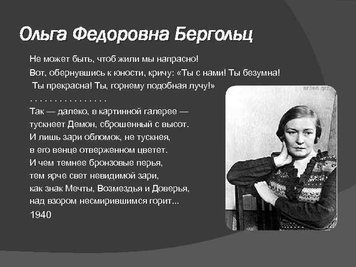 Ольга Федоровна Бергольц Не может быть, чтоб жили мы напрасно! Вот, обернувшись к юности, кричу: «Ты с нами! Ты безумна! Ты прекрасна! Ты, горнему подобная лучу!» . . . . Так — далеко, в картинной галерее — тускнеет Демон, сброшенный с высот. И лишь зари обломок, не тускнея, в его венце отверженном цветет. И чем темнее бронзовые перья, тем ярче свет невидимой зари, как знак Мечты, Возмездья и Доверья, над взором несмирившимся горит. . . 1940