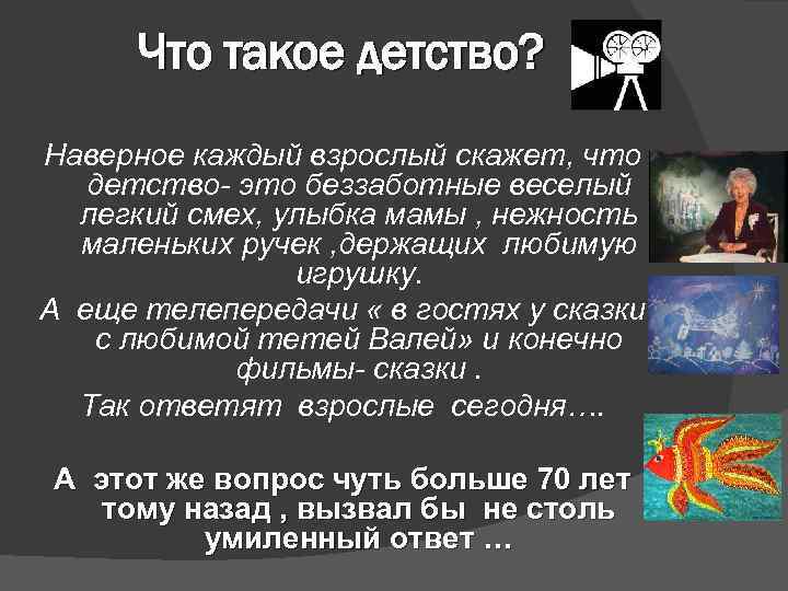 Что такое детство? Наверное каждый взрослый скажет, что детство- это беззаботные веселый легкий смех, улыбка мамы , нежность маленьких ручек , держащих любимую игрушку. А еще телепередачи « в гостях у сказки с любимой тетей Валей» и конечно фильмы- сказки. Так ответят взрослые сегодня…. А этот же вопрос чуть больше 70 лет тому назад , вызвал бы не столь умиленный ответ …