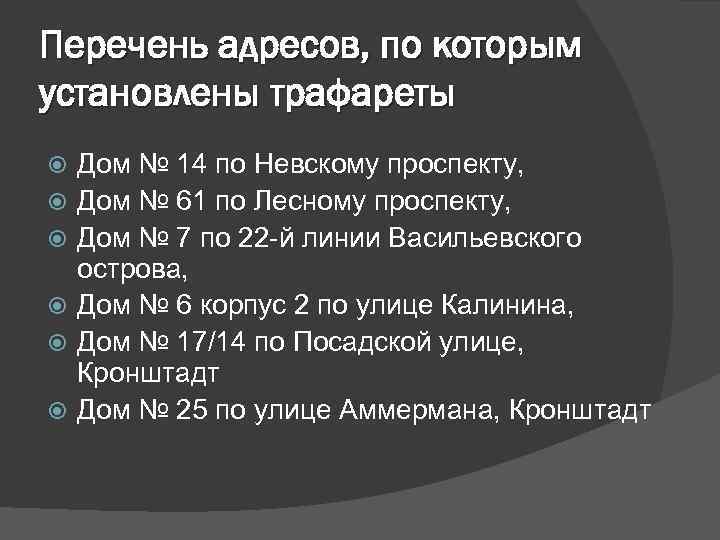 Перечень адресов, по которым установлены трафареты Дом № 14 по Невскому проспекту, Дом № 61 по Лесному проспекту, Дом № 7 по 22 -й линии Васильевского острова, Дом № 6 корпус 2 по улице Калинина, Дом № 17/14 по Посадской улице, Кронштадт Дом № 25 по улице Аммермана, Кронштадт