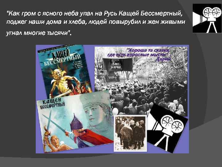 "Как гром с ясного неба упал на Русь Кащей Бессмертный, поджег наши дома и хлеба, людей повырубил и жен живыми угнал многие тысячи".