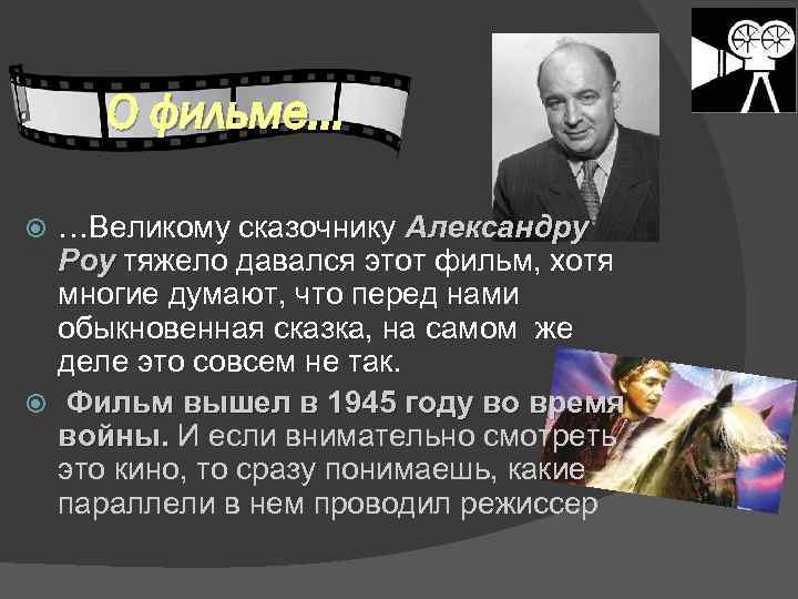 О фильме… …Великому сказочнику Александру Роу тяжело давался этот фильм, хотя Роу многие думают, что перед нами обыкновенная сказка, на самом же деле это совсем не так. Фильм вышел в 1945 году во время войны. И если внимательно смотреть войны. это кино, то сразу понимаешь, какие параллели в нем проводил режиссер