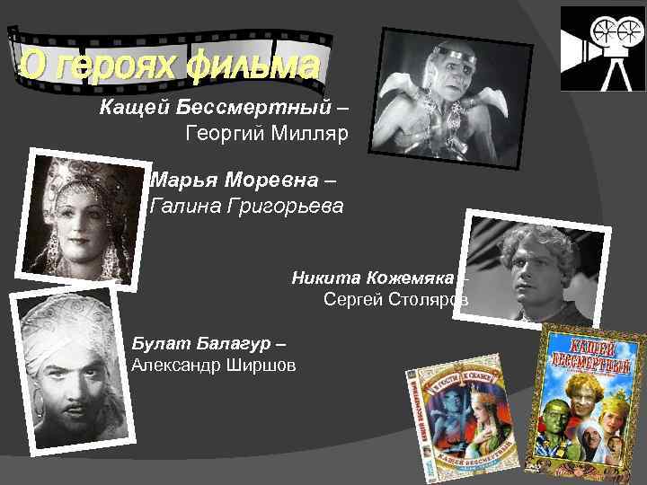О героях фильма Кащей Бессмертный – Георгий Милляр Марья Моревна – Галина Григорьева Никита Кожемяка – Сергей Столяров Булат Балагур – Александр Ширшов