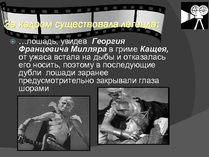 За кадром существовала легенда: …лошадь, увидев Георгия Францевича Милляра в гриме Кащея, Францевича Милляра Кащея, от ужаса встала на дыбы и отказалась его носить, поэтому в последующие дубли лошади заранее предусмотрительно закрывали глаза шорами