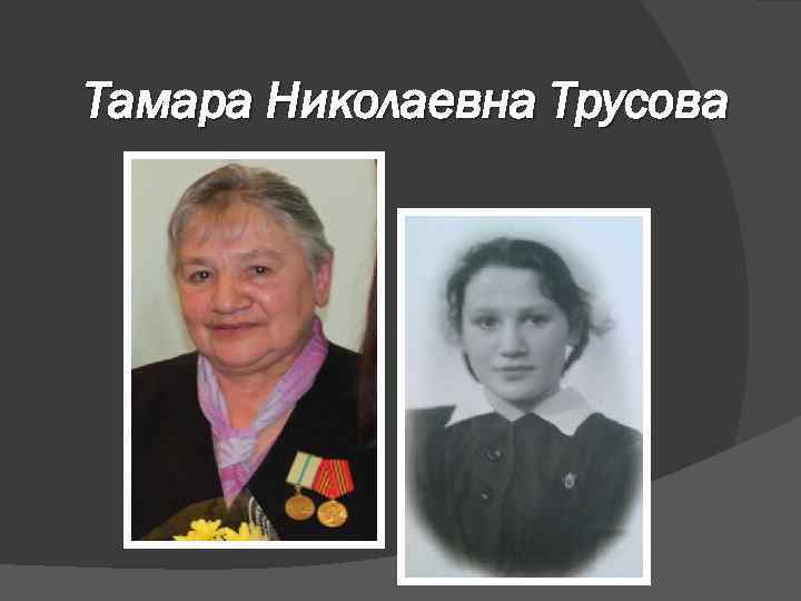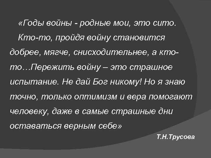 «Годы войны - родные мои, это сито. Кто-то, пройдя войну становится добрее, мягче, снисходительнее, а ктото…Пережить войну – это страшное испытание. Не дай Бог никому! Но я знаю точно, только оптимизм и вера помогают человеку, даже в самые страшные дни оставаться верным себе» Т. Н. Трусова