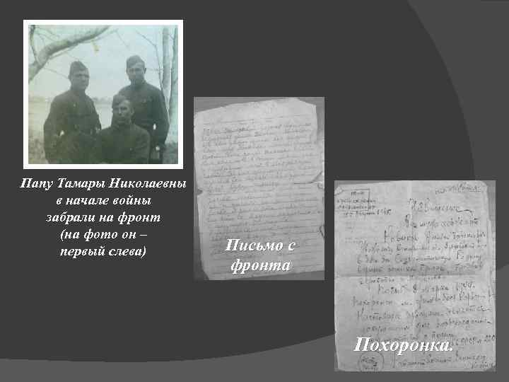 Папу Тамары Николаевны в начале войны забрали на фронт (на фото он – первый слева) Письмо с фронта Похоронка.