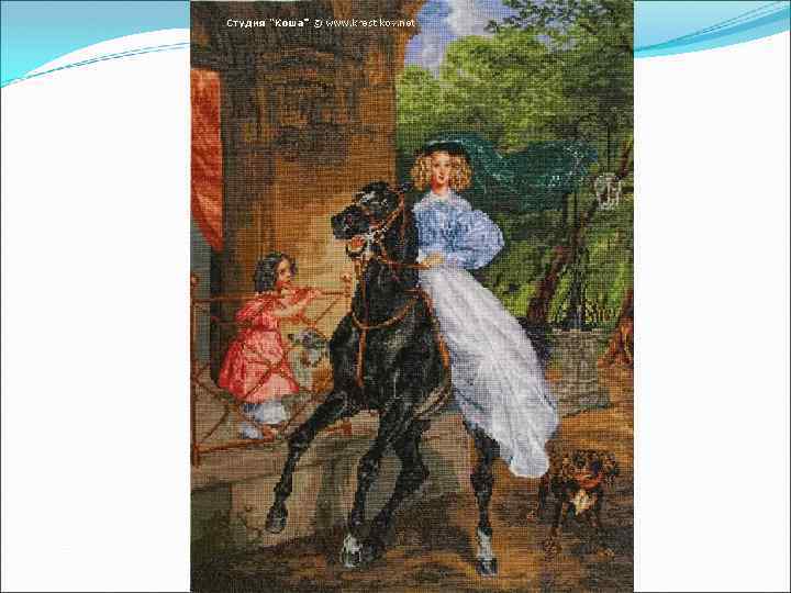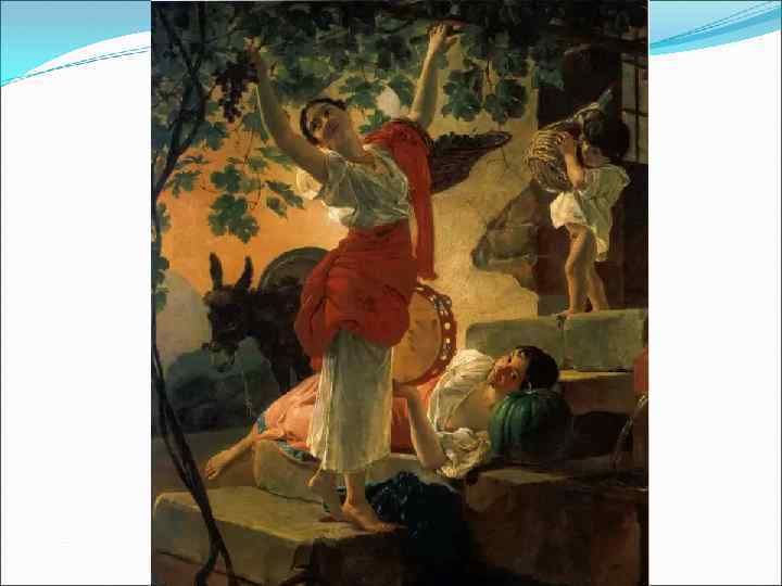 В Италии, в 1832 г. К. Брюллов написал знаменитую "Всадницу", грациозно сидящую на великолепном скакуне. Скромную воспитанницу графини Ю. Самойловой — Джованину, художник осмелился изобразить так, как до него изображали только титулованных особ или прославленных полководцев. Задумав написать «Всадницу» , Брюллов поставил перед собой задачу создать большой конный портрет. В нем он использовал мотив прогулки, позволившей передать фигуру в движении. На всем скаку останавливает всадница разгоряченного коня. Уверенная ловкость амазонки вызывает неподдельное восхищение у подбежавшей к балкону маленькой девочки, как бы призывая зрителя разделить ее восторг.