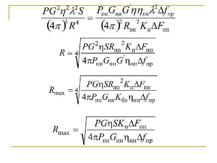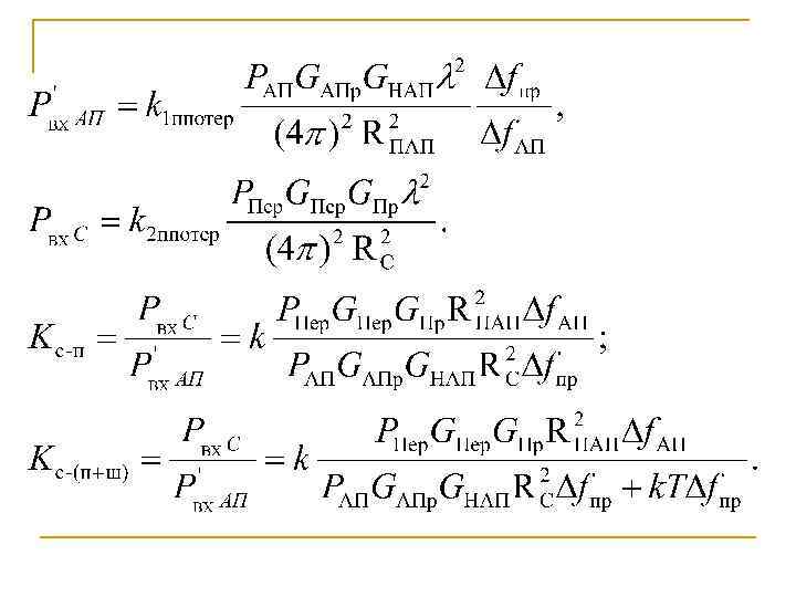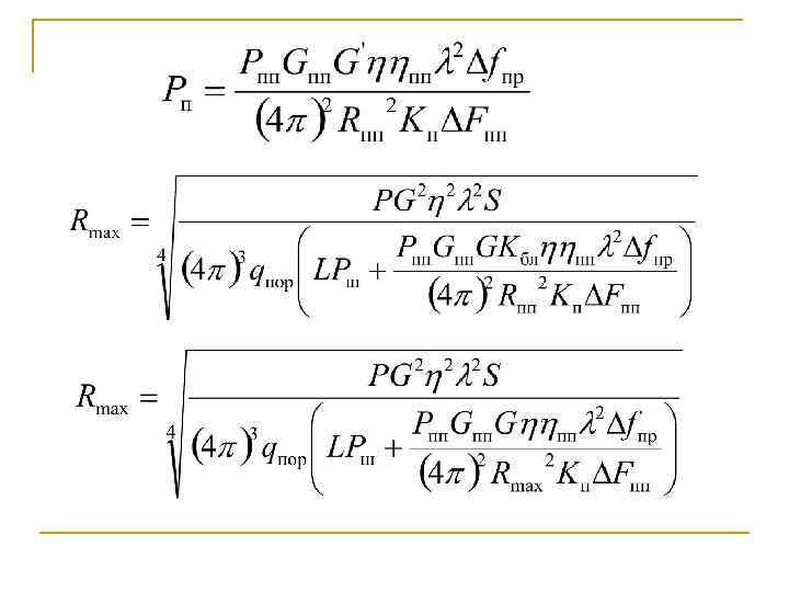 kс, kп – коэффициенты передачи сигнала и помехи по мощности. μ= Kс max = N; kп=Pш/Pп, где N – число импульсов в пачке. . соответствует минимальной чувствительности приемника РЛС. Формулы для PР и R отражают взаимозависимость энергетических и вероятностных параметров РЛС в условиях помех.